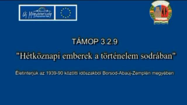 Az interjúalany felvázolja a harmincas évektől a Kádár-korszakig a főbb állomásokat (0:30), majd megemlíti a beszolgáltatási rendszert (3:30). Szól arról, hogy a háború alatt iskolába járt (6:00), majd rátér a bombázásokra (7:30). Elmeséli, hogyan kellett édesapjának és a katonáknak kivinni a leventéket Németországba, és hogyan tudtak mégis visszafordulni (9:50). Szól az orosz megszállásról, arról, hogyan menekültek ki fiatal lányokként a pincéből az erőszak elől, valamint arról, hogy végül másokat erőszakoltak meg (13:50). Szól arról, hogy a később jövő kozákok már rendesebbek voltak, de később is ki kellett egyszer szaladniuk a rétre az erőszak elől. Arról is szól, hogy hány nőt becstelenítettek meg a faluban, hogyan lettek betegek, és arról, hogy még ők szégyellték magukat (17:15). Szól a hitéletről, a vallási nevelésről, és arról, hogy beléjük ivódott a becsület és a szüzesség eszméje (23:18). Szól az 1950-es évekről, a beszolgáltatási rendszerről és arról, hogy lehetett társulni is a beszolgáltatásban, kivéve, ha valakinek több földje volt (26:38). Szól a körülmények javulásáról a Kádár-korszakban, valamint a TSZ-ek megszervezéséről (32:05). Végül a munkákról és a házépítésről szól (37:00).