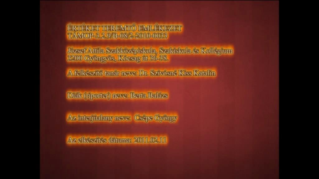 Az interjúalany beszél II. világháborús élményeiről, amit Szombathely közelében élt meg (3:15). Később rátér diákéveire, házasságára (12:37). Később beszél az 1956-os forradalomról (16:33). Férjét megbízták Nigéria térképének elkészítésével. E célból tett utazásukról, az ottani tapasztalatokról hosszan beszél (19:27).