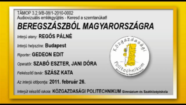 Az interjúalany beszél gyermekkoráról és családjáról, valamint a háborús hétköznapokról (0:12), majd rátér az élelmiszerellátás és a a háború alatti megélhetés kérdésére (3:27). Szól arról, hogyan élte meg gyermekként Kaposvár bombázását (5:40), majd arról, hogyan értesültek a háború eseményeiről, és hogyan hallgatták Horthy Miklós kiugrási rádióbeszédét (7:18). Rátér az orosz katonák viselkedésének leírására, majd a háború utáni életkezdésre (9:12). Szól a hiperinflációról és a forint bevezetéséről (12:10), az 1950-es évek szellemiségéről (13:20). Szól arról, hogyan értékeli az 1956-os forradalmat (13:50), majd arról, hogyan formálta át a szocializmus a mindennapi életet (14:50). Szól arról, hogy mi történt Kaposvárott 1956-ban, majd a Kádár-korszak jobb megélhetési körülményeit elemzi (19:55).